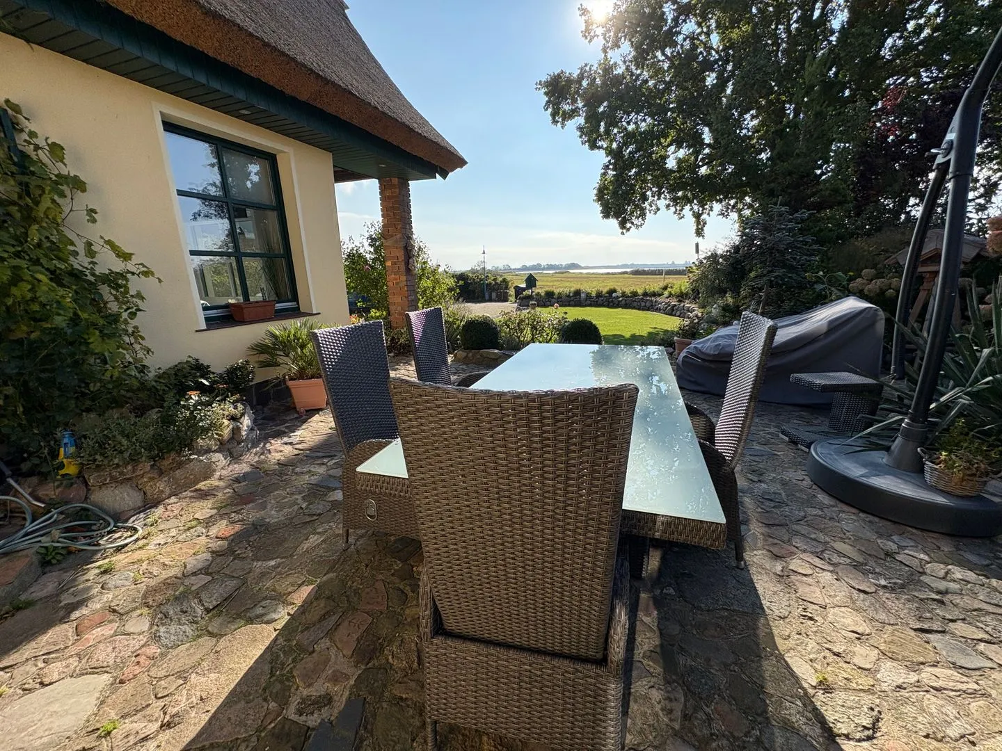 Große Terrasse mit Sitzmöbeln, Sonnenschirm & Strandkorb