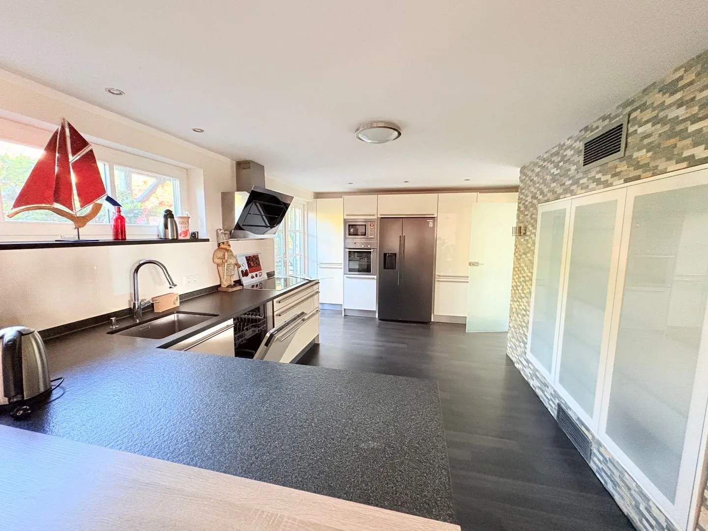 Im großzügigen Wohnbereich erwartet Sie eine gemütliche Sofaecke mit Kaminofen – perfekt für entspannte Abende. Die hochwertig ausgestattete Küche erfüllt alle Wünsche für die Selbstverpflegung.