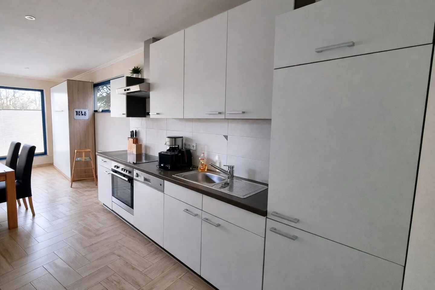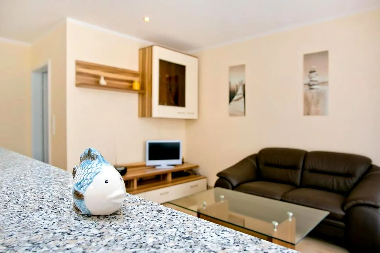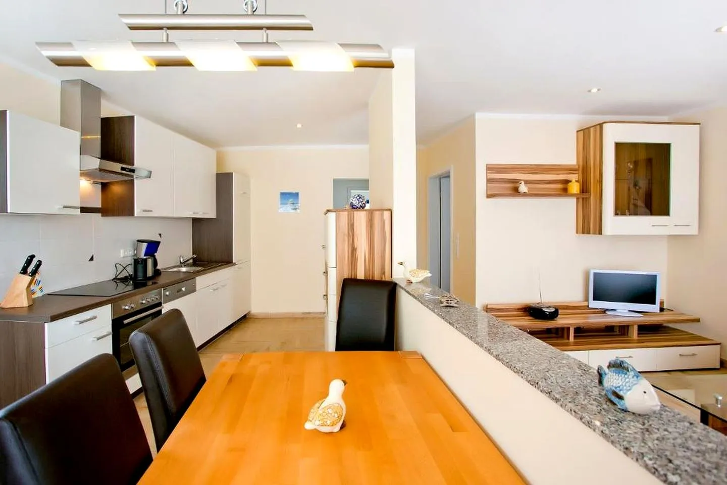Der lichtdurchflutete Wohnbereich ist modern eingerichtet und verfügt über eine integrierte Küchenzeile. Im separaten Schlafzimmer erwartet Sie ein komfortables Doppelbett. Zusätzlich steht im Wohnraum ein ausziehbares Schlafsofa zur Verfügung.