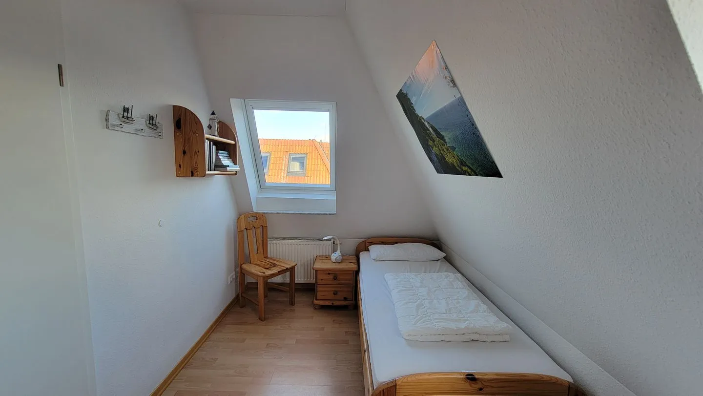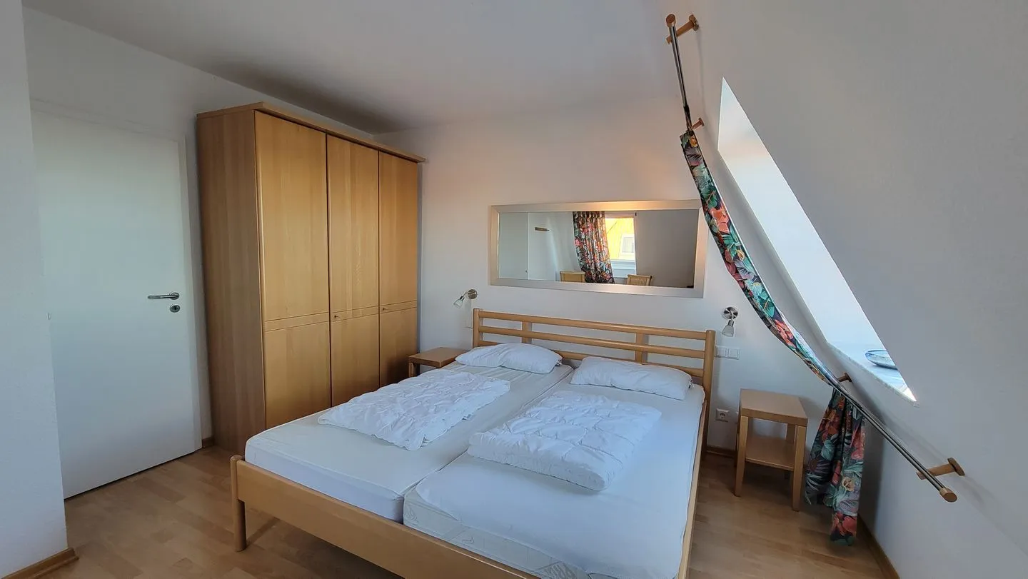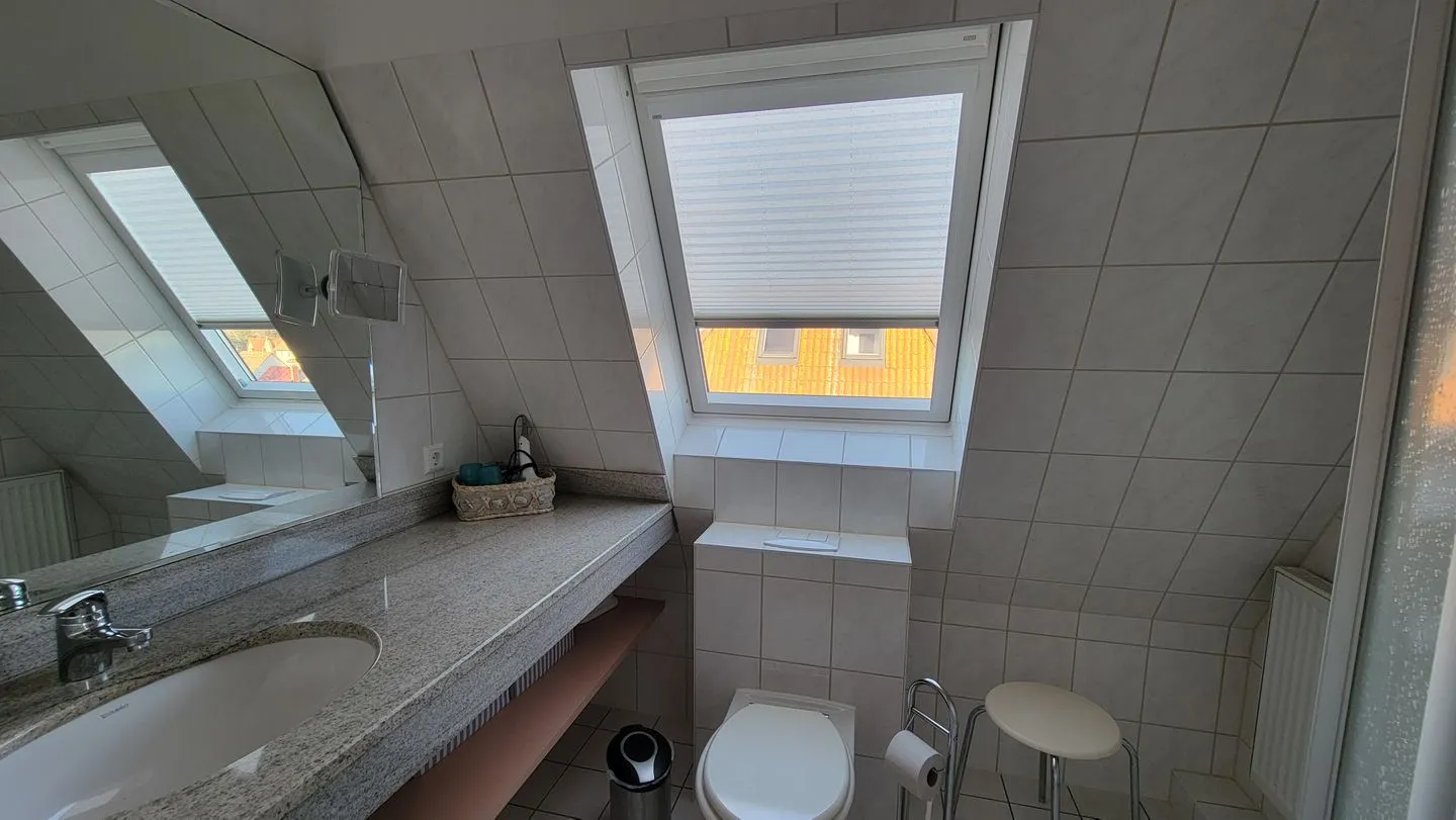 In der oberen Ebene befinden sich zwei Schlafräume mit Verdunklungsmöglichkeit und das Badezimmer mit großem Fenster.