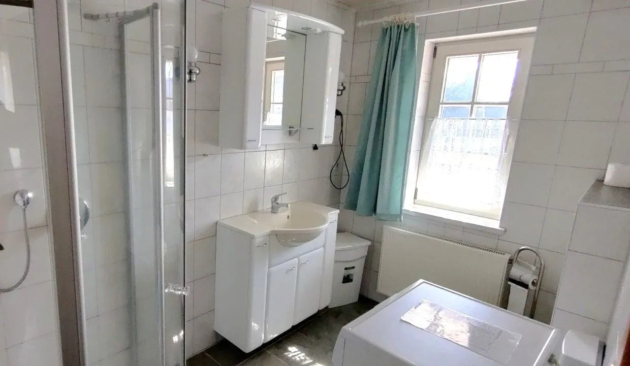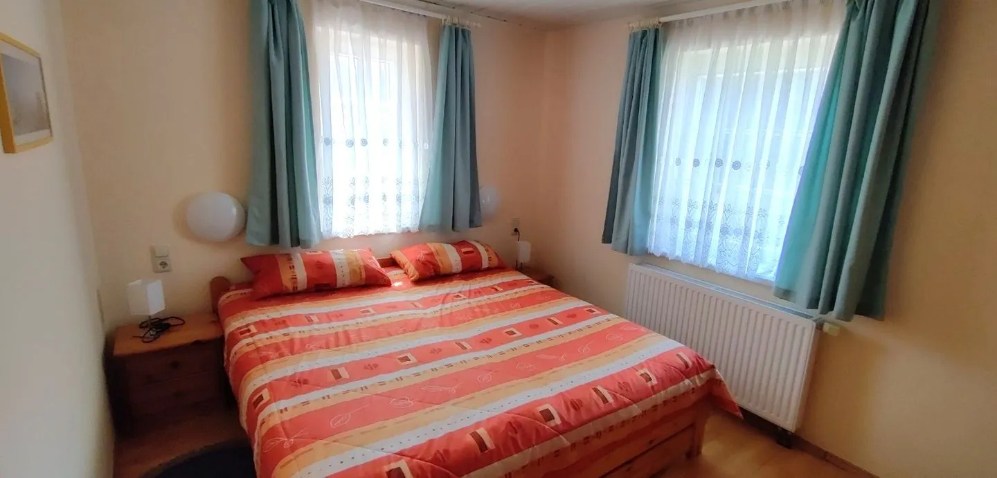 Das Schlafzimmer mit großem Doppelbett, hellen Vorhängen und sanften Farben sorgt für erholsamen Schlaf. Das Badezimmer verfügt über Dusche und Waschmaschine .