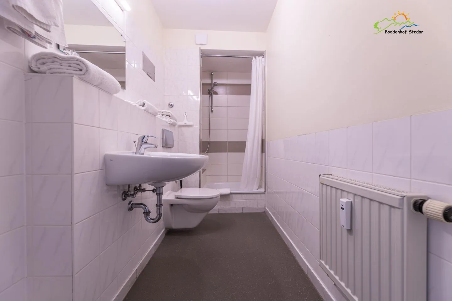 Das moderne Badezimmer verfügt über Dusche und WC.