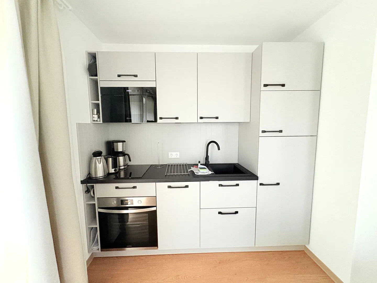 Die Küchenzeile ist mit einem Kühlschrank, einer Mikrowelle und einer Kaffeemaschine ausgestattet – ideal für Ihre Selbstverpflegung.